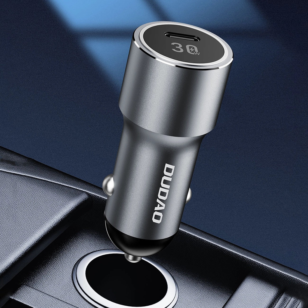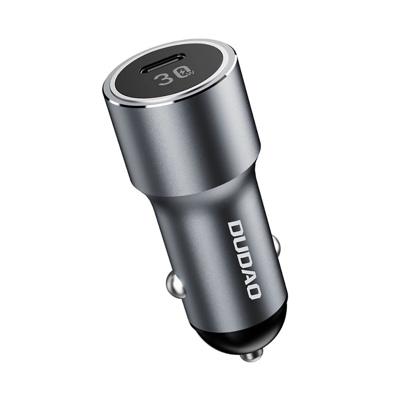 Carregador automóvel compacto e potente da Dudao, modelo R14, com saída USB-C Power Delivery de 30W. Ideal para carregar rapidamente smartphones, tablets e outros dispositivos compatíveis durante as viagens. O design em cor prata garante um visual moderno e discreto para o interior do veículo.