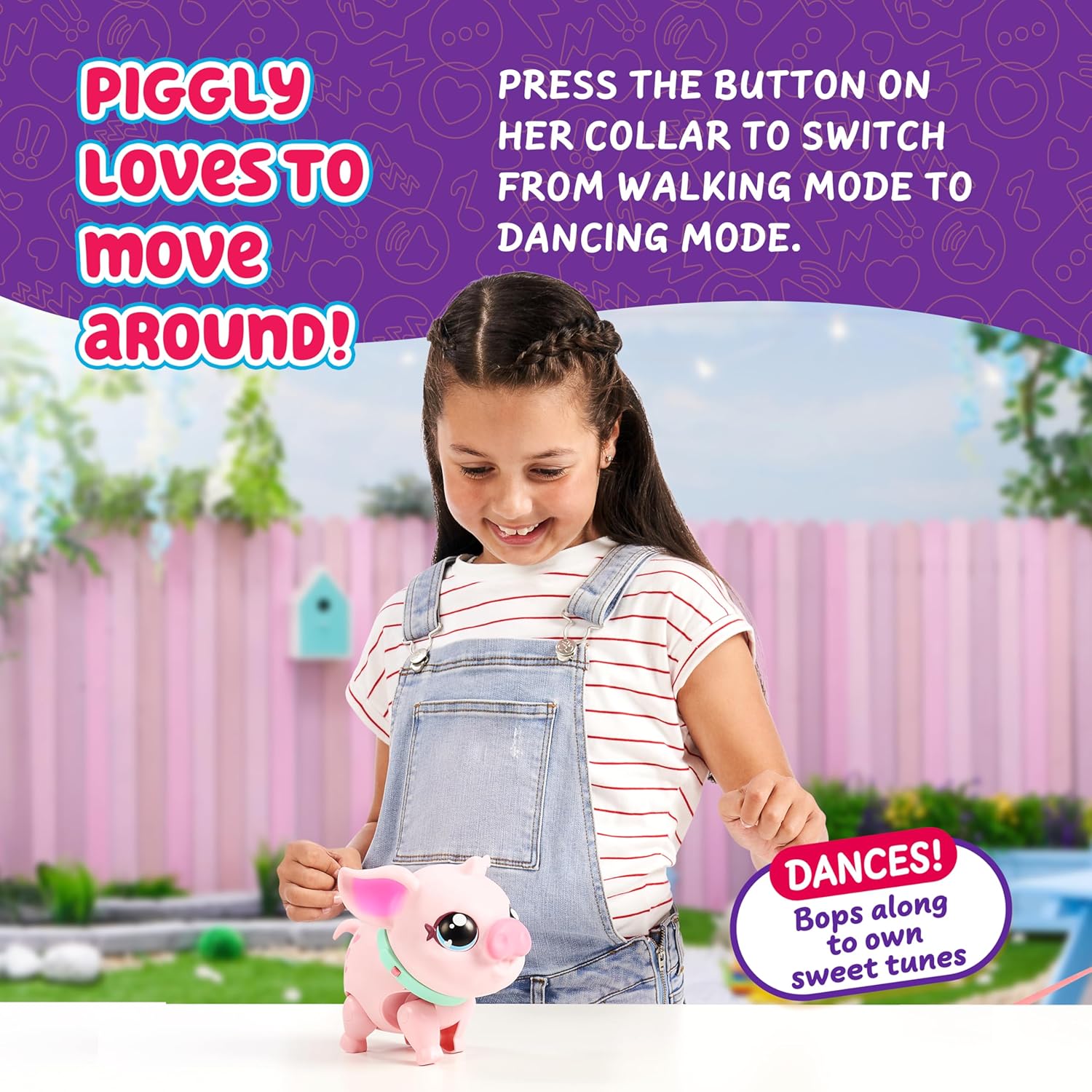Com mais de 25 sons e reações diferentes, a Piggly caminha, dança, come e responde ao toque com gestos carinhosos e sons realistas — tal como um porquinho verdadeiro!