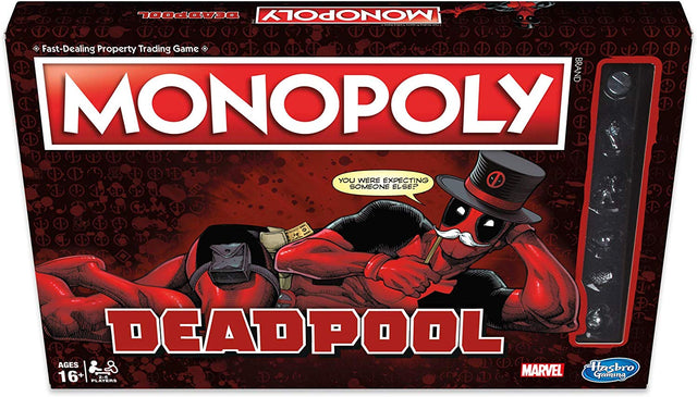 Introducing the Monopoly game inspired by the popular anti-hero, Dead pool. This edition includes everything players need for traditional Monopoly gameplay, with elements based on the characters, art, and dry humour of Marvel's comic book character. Players get to choose from Dead pool-themed locations, and tokens including the Dead pool logo, an "okay" hand, a Dead pool Bomb, a unicorn, a taco, and a chefs hat. Marvel. All trademarks and registered trademarks are the property of their respective owners. The Hasbro Gaming, Parker brothers, and Monopoly names and logos, the distinctive design of the game board, the four corner squares, the Mr. Monopoly name and character, as well as each of the distinctive elements of the board and playing pieces are trademarks of Hasbro for its property trading game and game equipment.