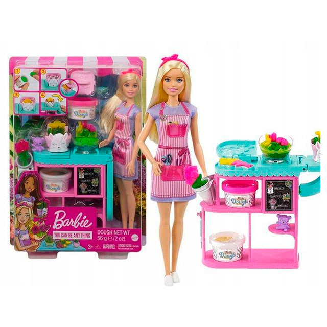Barbie Florista Boneca loira com loja de flores e acessórios. Inclui jogo de plasticina.