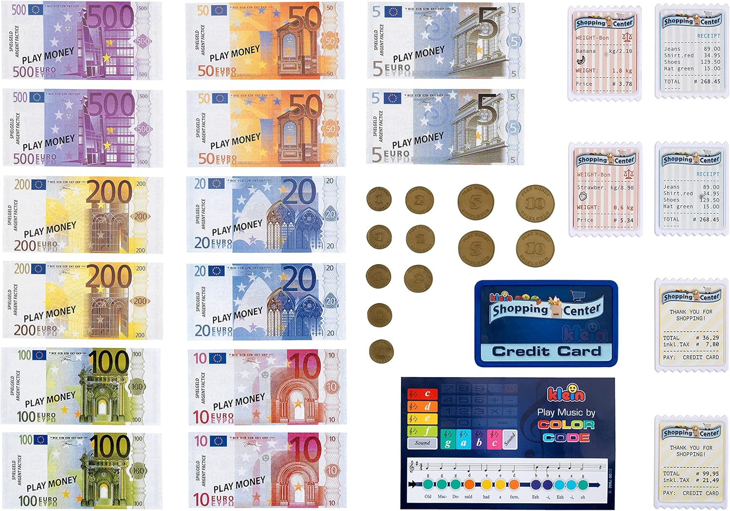 • Inclui moedas e notas de brincar, bem como cartão de crédito de brinquedo.