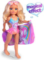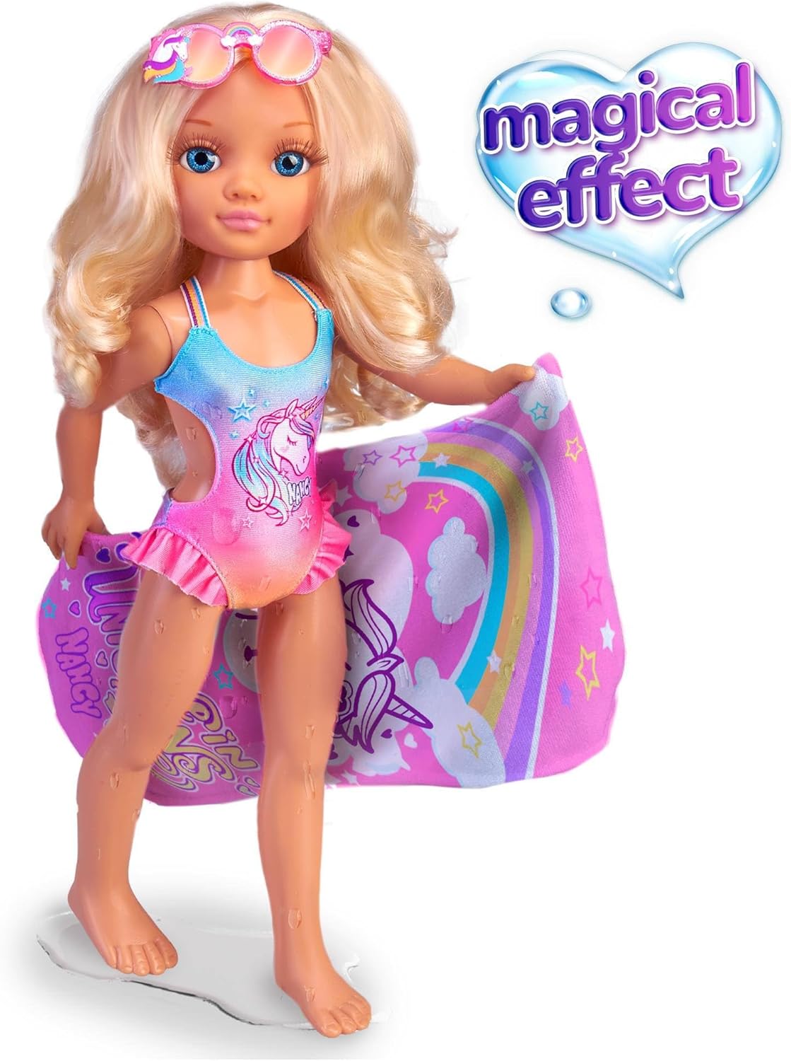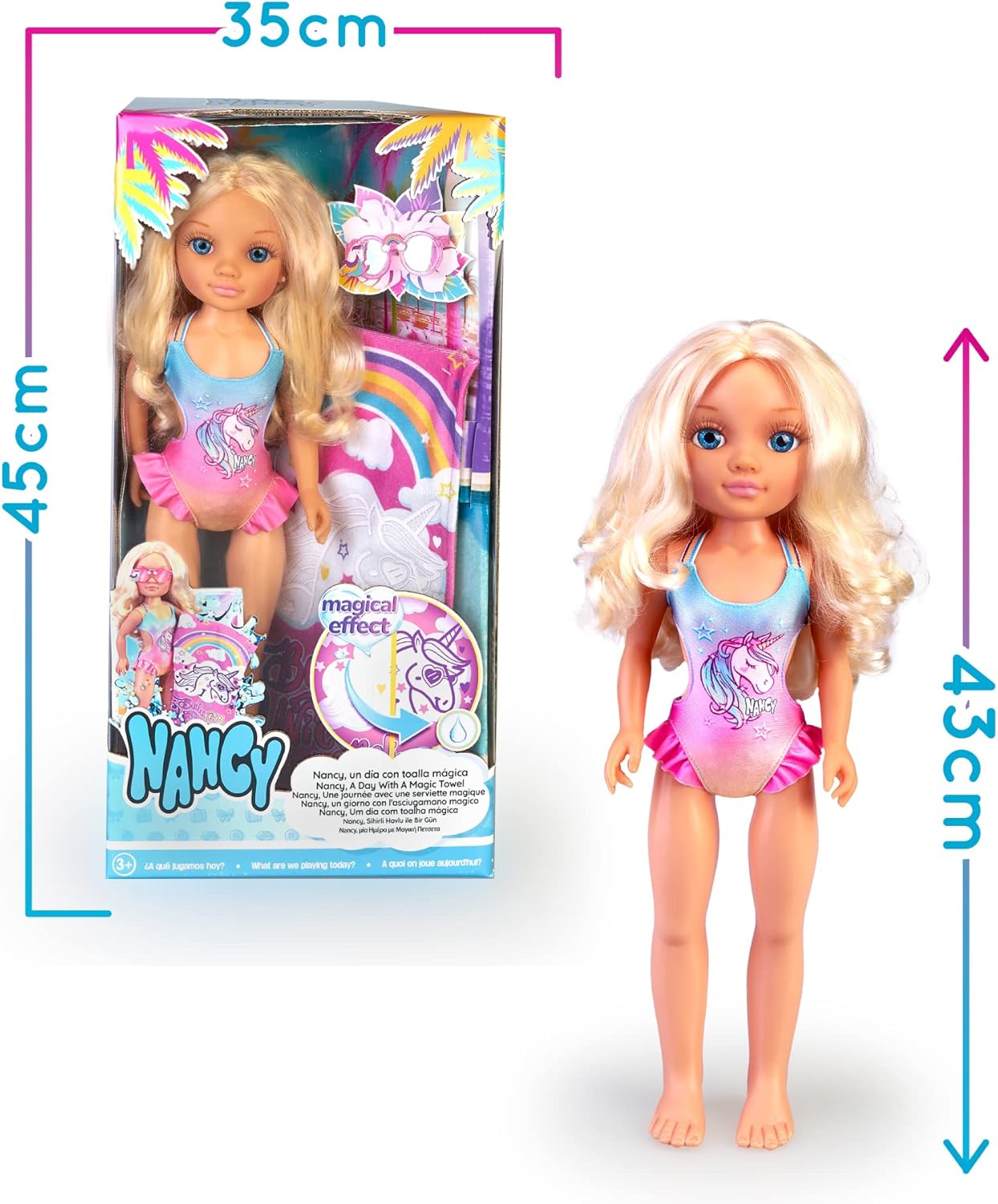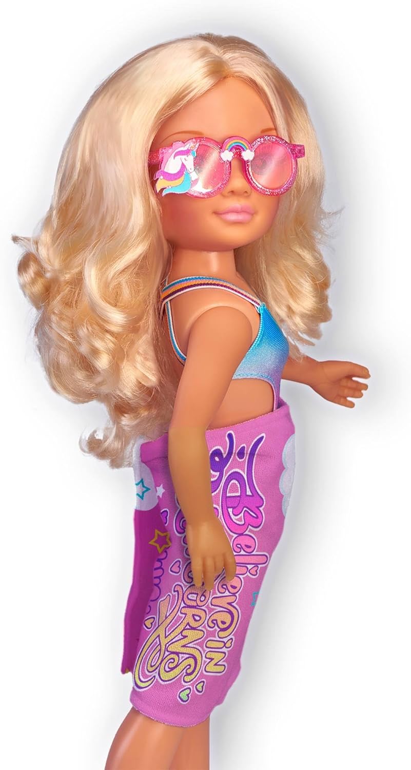 - Esta boneca Nancy é legal, com um visual de verão bonito e autêntico, composto por um fato de banho colorido com estampado de unicórnio e folhos nas laterais