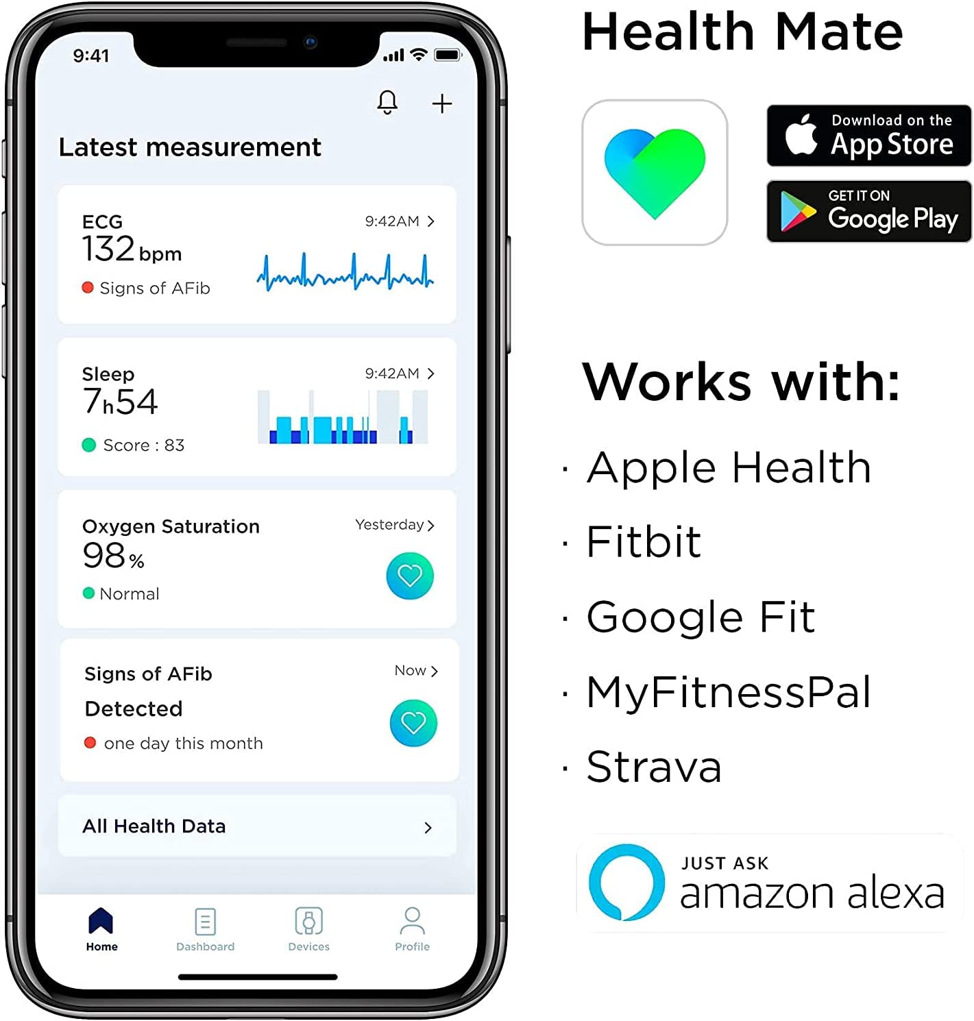 - Eletrocardiograma: a função de ECG permite detetar a fibrilação auricular, determinar se o pulso cardíaco é normal e controlar se a frequência cardíaca é alta ou baixa em apenas 30 segundos