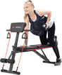 - Banco multifuncional tudo em 1: Equipado com 2 alças de treino e uma almofada de suporte para braços / abdómen. O nosso banco multifuncional dobrável é excelente para um treino de corpo inteiro em casa para moldar os seus braços, abdominais, costas, peito. Um equipamento de exercício ideal para o corpo inteiro em casa.