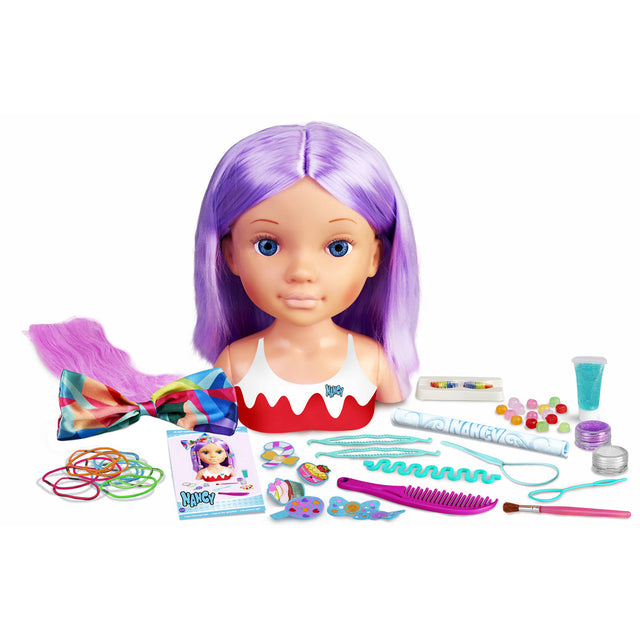 Nancy - Um Dia de Segredos de Beleza Violeta, um busto com muitos acessórios para pentear e maquilhar a Nancy. Tem com o cabelo roxo e mais de 20 acessórios, entre os quais purpurina, elásticos, extensões, giz para decorar e muito mais. Diverte-te ao pentear e ao maquilhar a Nancy de mil maneiras diferentes!
